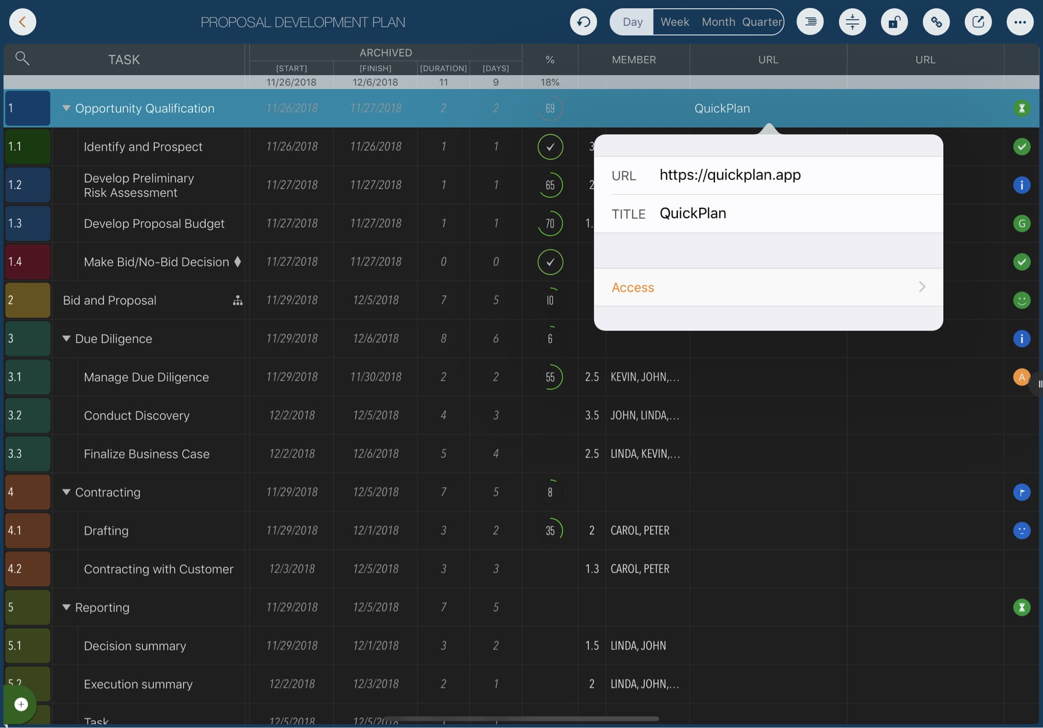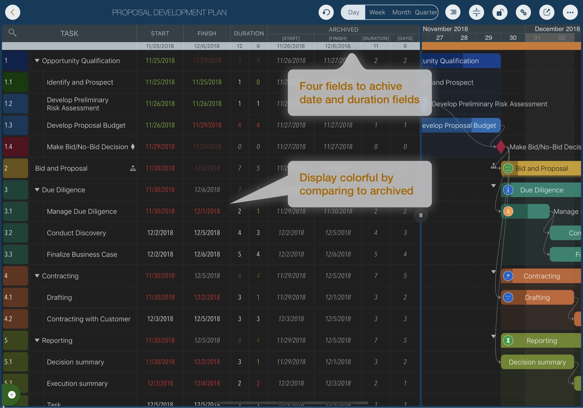 - Archive active date and duration fields (copy from the active fields to archive fields). QuickPlan supports to archive for all the tasks together, and we can't edit a specific cell of archive fields.