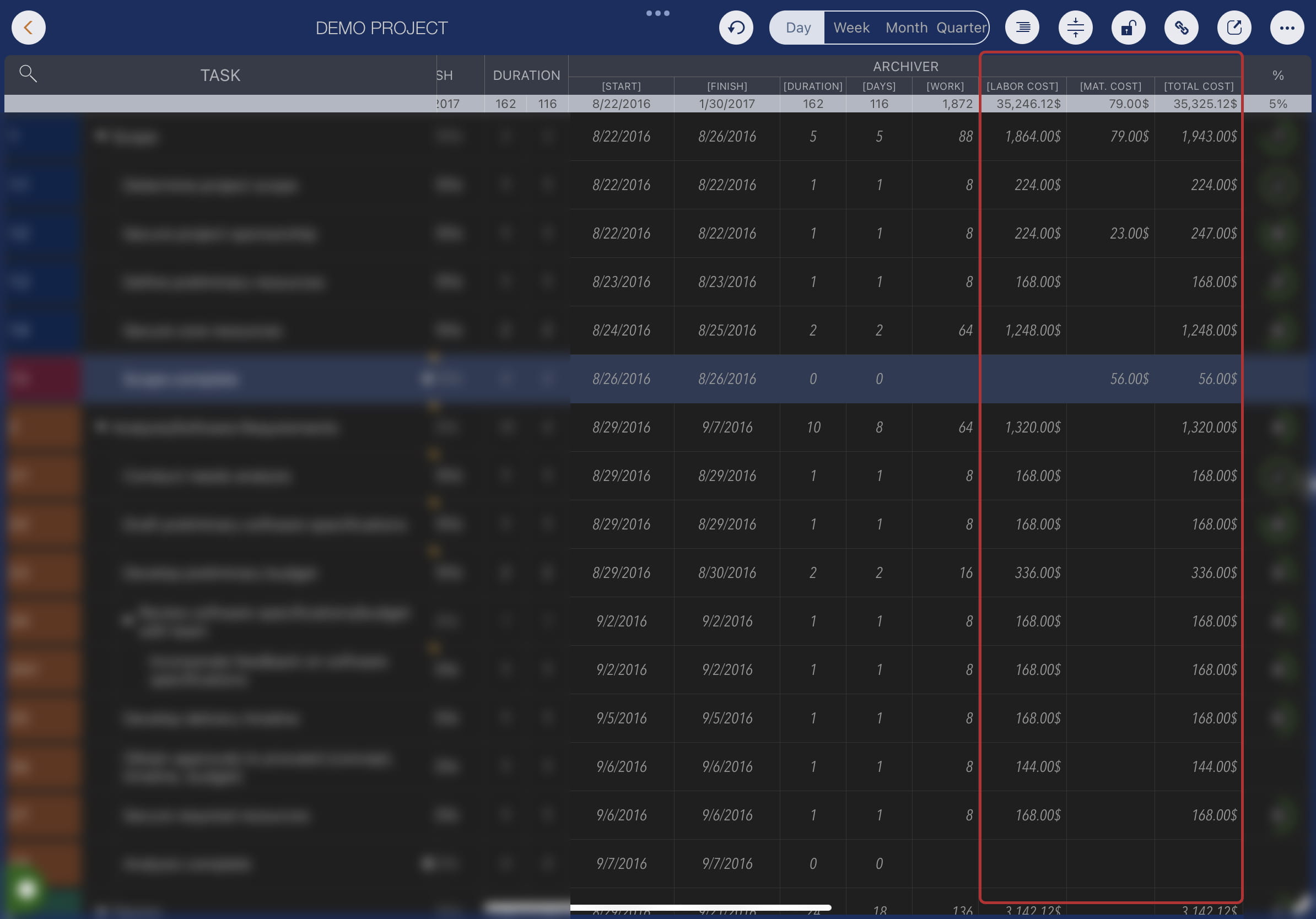 The baseline feature now archives the task work and costs fields along with the date and duration fields, allowing you to compare the actual and archived data of your project.