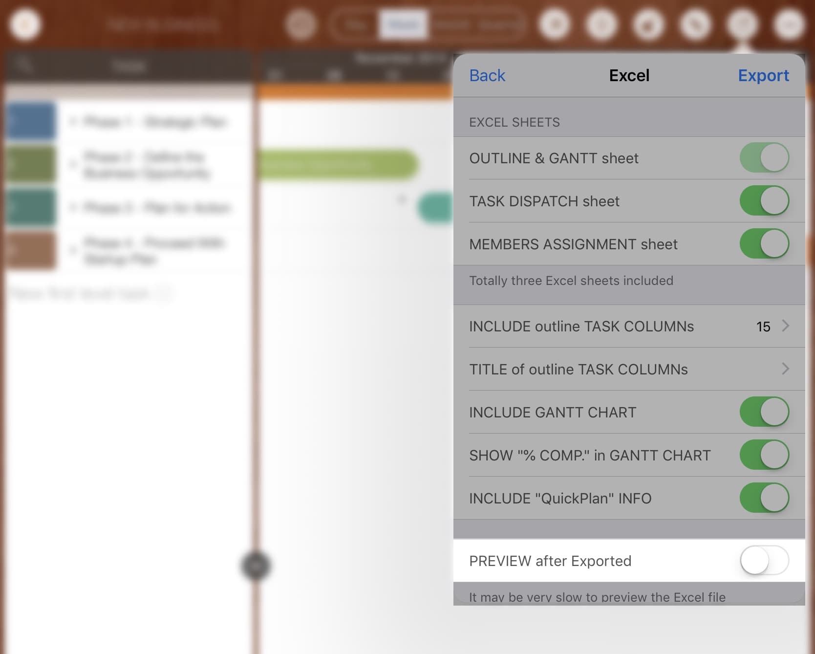 There is an option to specify if need to preview the Excel file, as It may take very long time for the iOS to render the content of exported Excel file. By default the option is disabled.