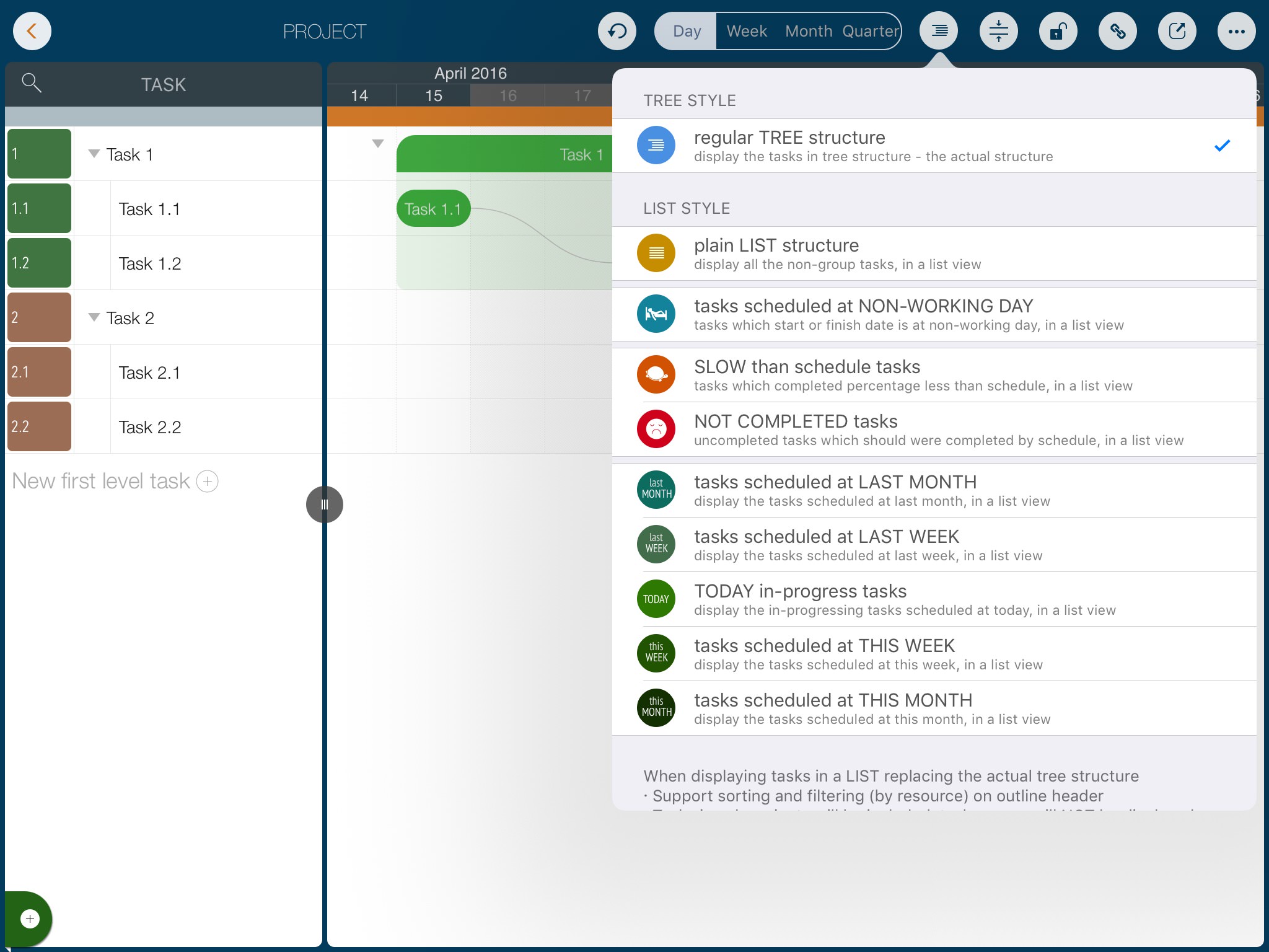 In addition to the basic way of displaying tasks as a tree structure, the app also supports displaying all tasks as a list