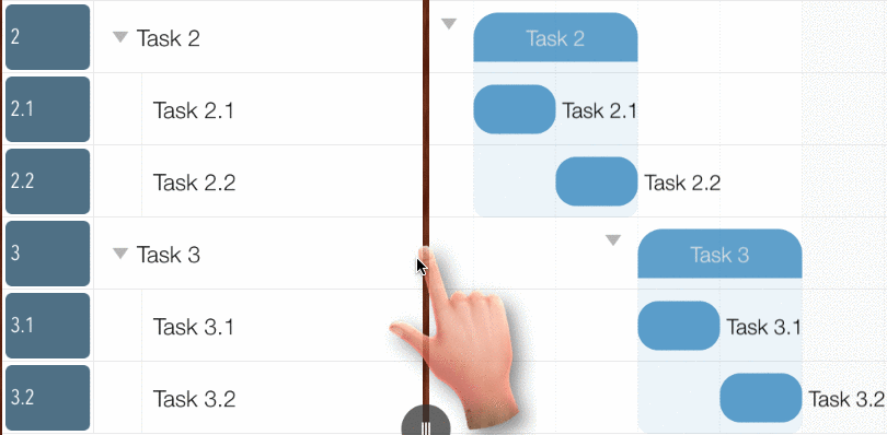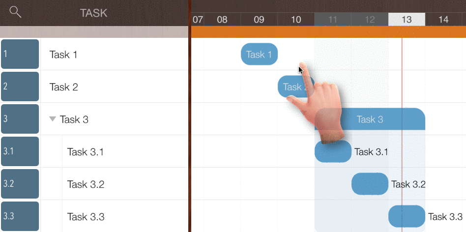 - Pan horizontally on the selected task group or sub-project task to change the task date of all the children simultaneously.