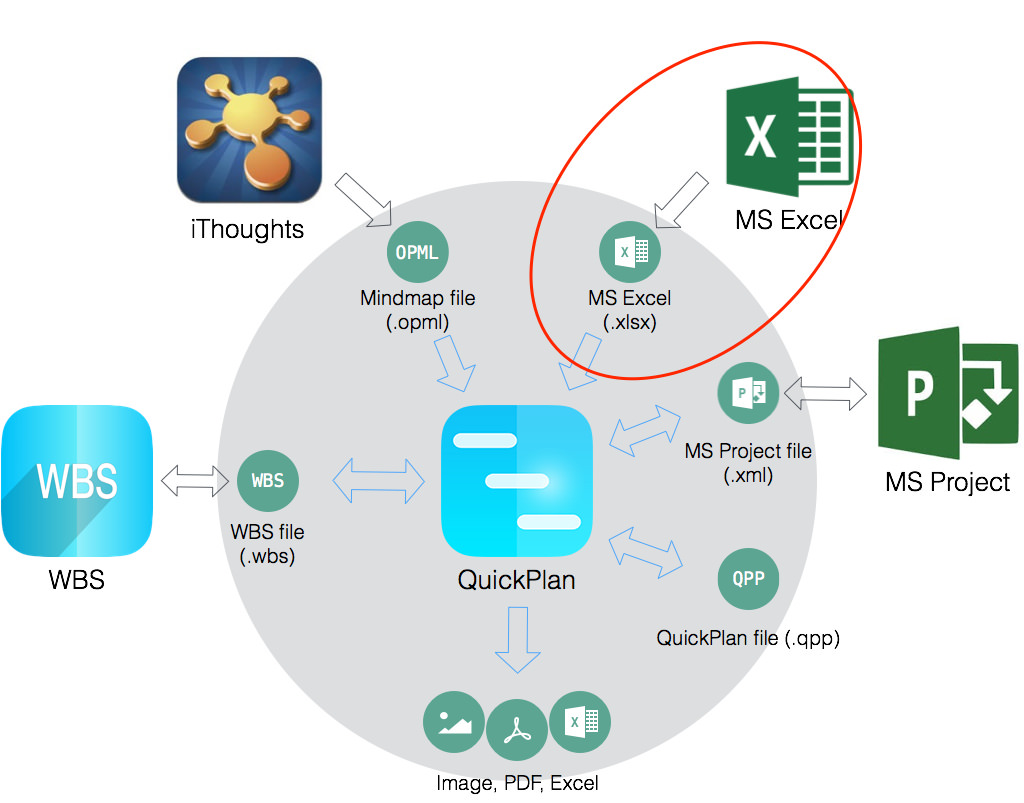 - QuickPlan also supports exporting the project to an MS Excel file for REPORTING! The content and format of the exported Excel file are NOT the same as in this template. Some users may expect to change the content in the exported Excel file and then import it again - a bidirectional workflow. This is not a suitable solution because the QuickPlan app has no control over what the user enters into the Excel file. It is very easy to create errors in the Excel file.
