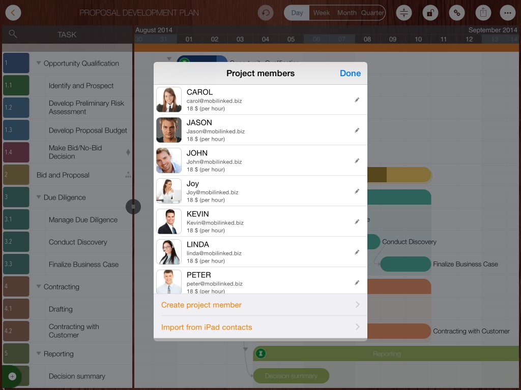 - Project members can be created manually or by importing from iOS contacts.