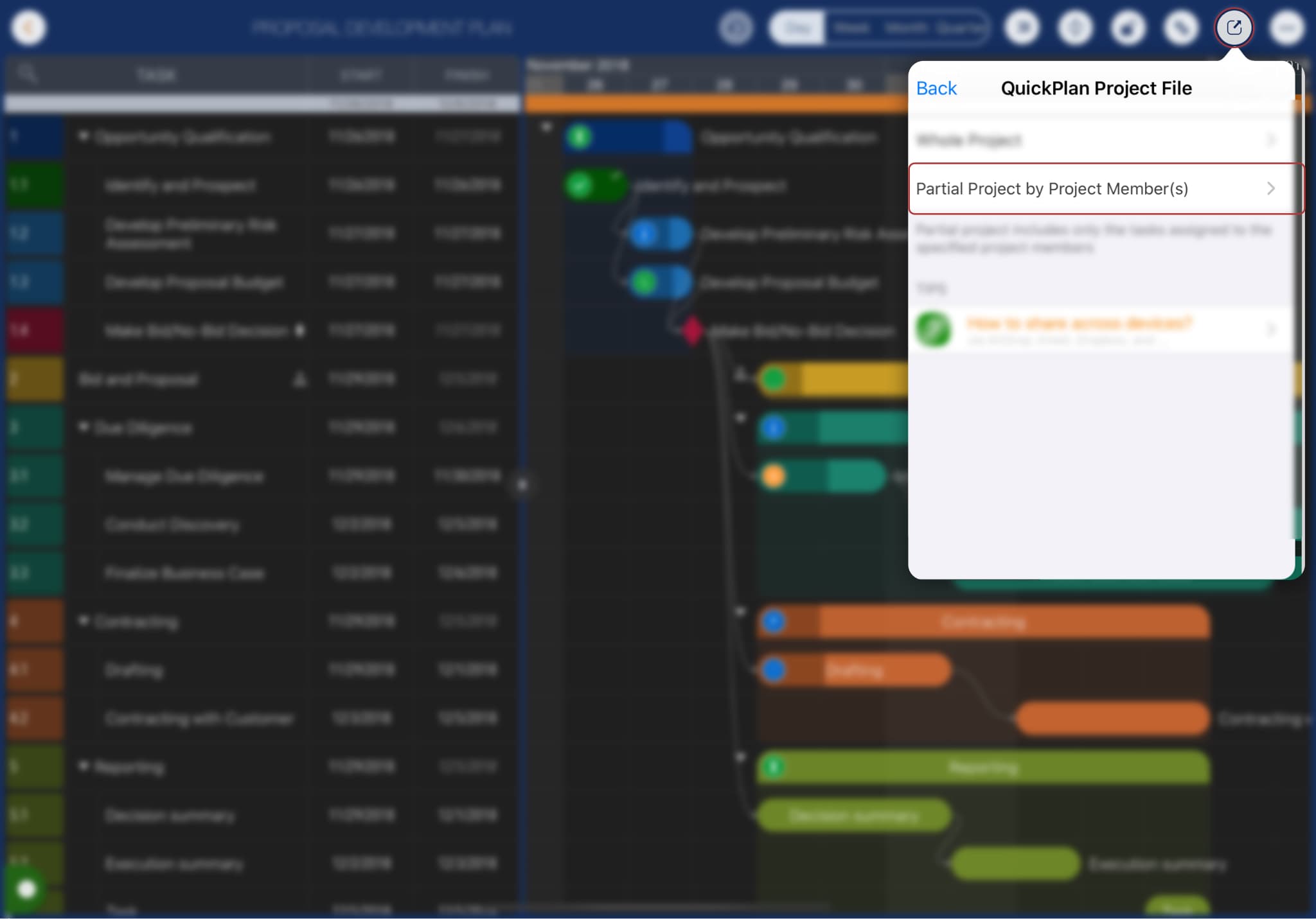 QuickPlan provides the options to export the whole project and part of the project. The partial project includes the tasks with the specific project members assigned, which is a suitable way to work with your team members.