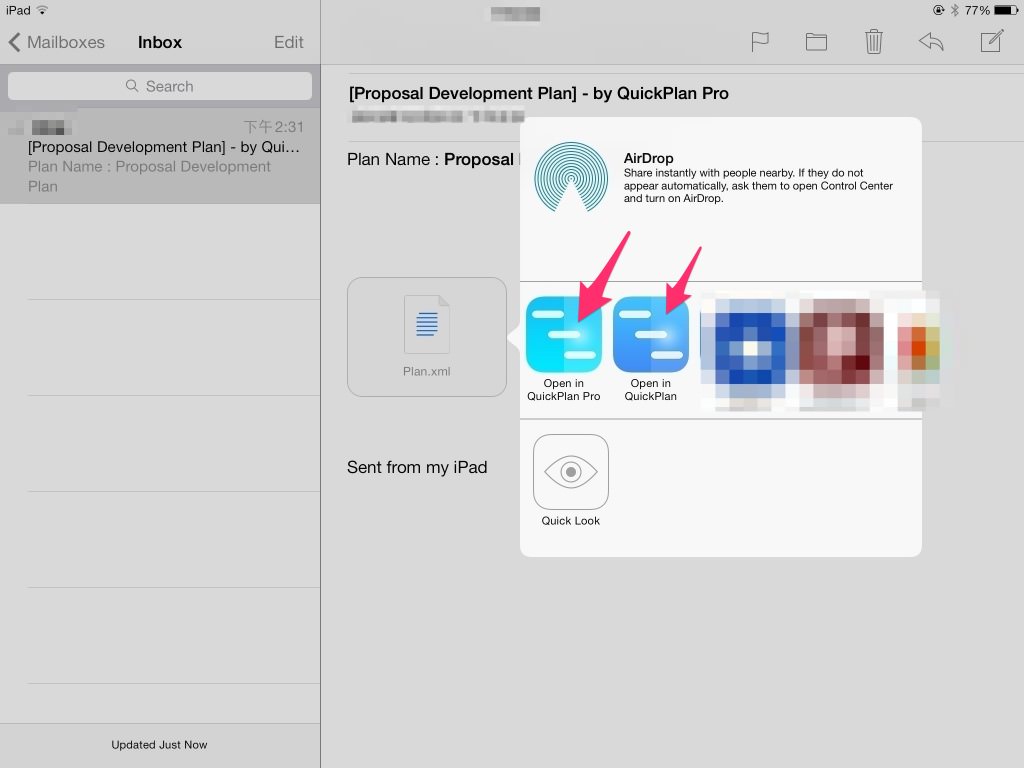 On the other devices, long-press the attached QuickPlan project file to import into QuickPlan app.