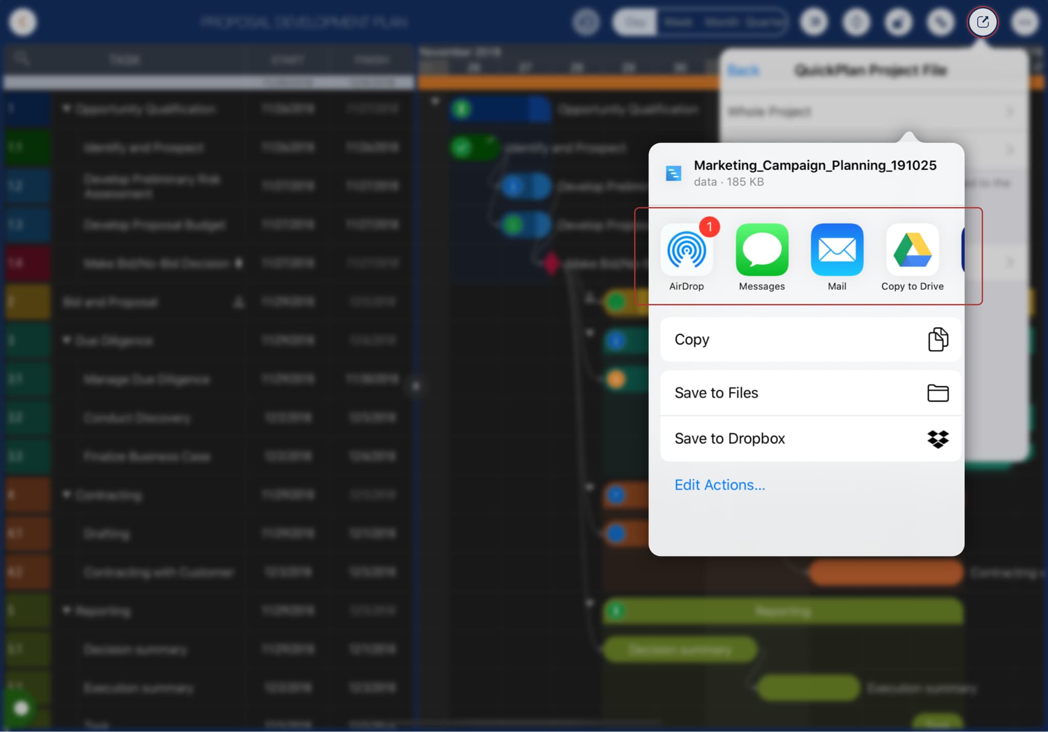 After a .qpp file generated, the system document interaction panel shows. There are some "actions" we can use to transfer the .qpp file to other devices. For example, via the AirDrop, Email, and Files app. And up to the apps you have installed on the device, we may find the actions for Dropbox, Google Drive, OneDrive, and more provided by other cloud storage apps.