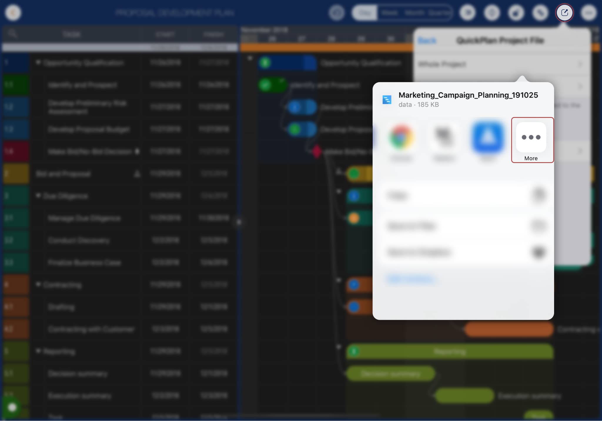 QuickPlan also supports to import from MS Project file in XML format (.xml), SwiftApp WBS file (.wbs), MS Excel file (.xlsx), and Mindmap file (.opml), via Files app. Please check out the details.