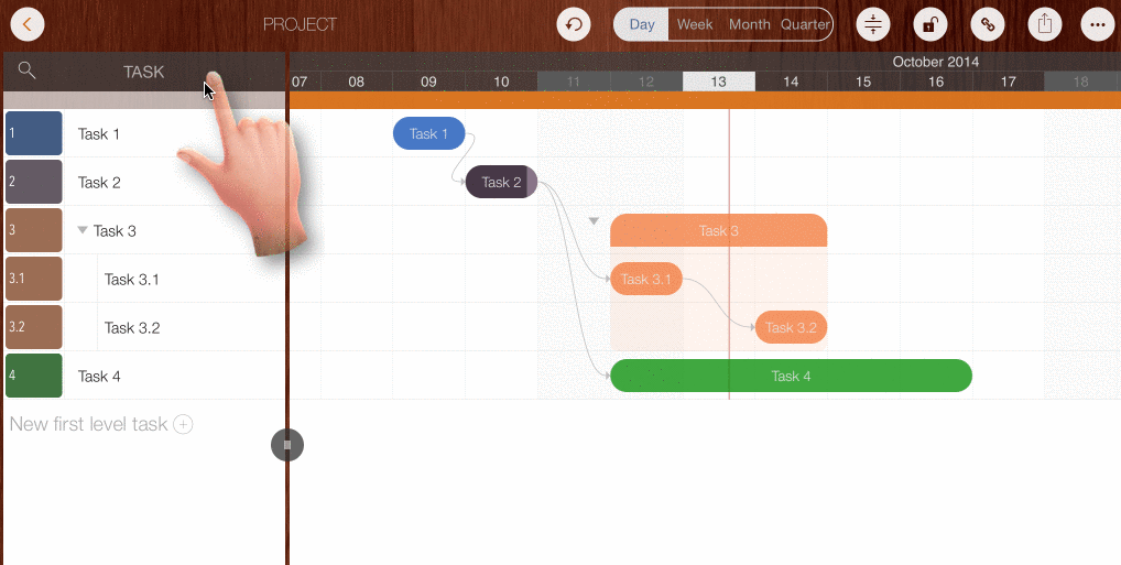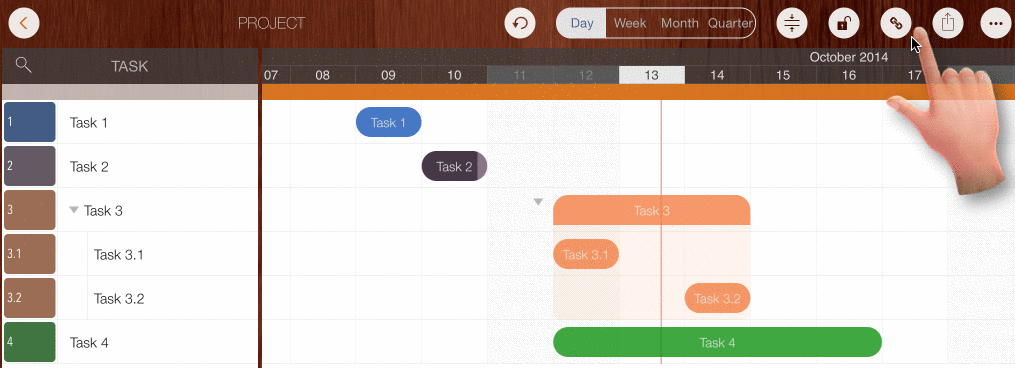 - Press the "Command" key and tap on another task to link them (or unlink them if they were already linked). If the "Option" key is also pressed, the successor task date may change to respect the to be created task (auto-schedule).