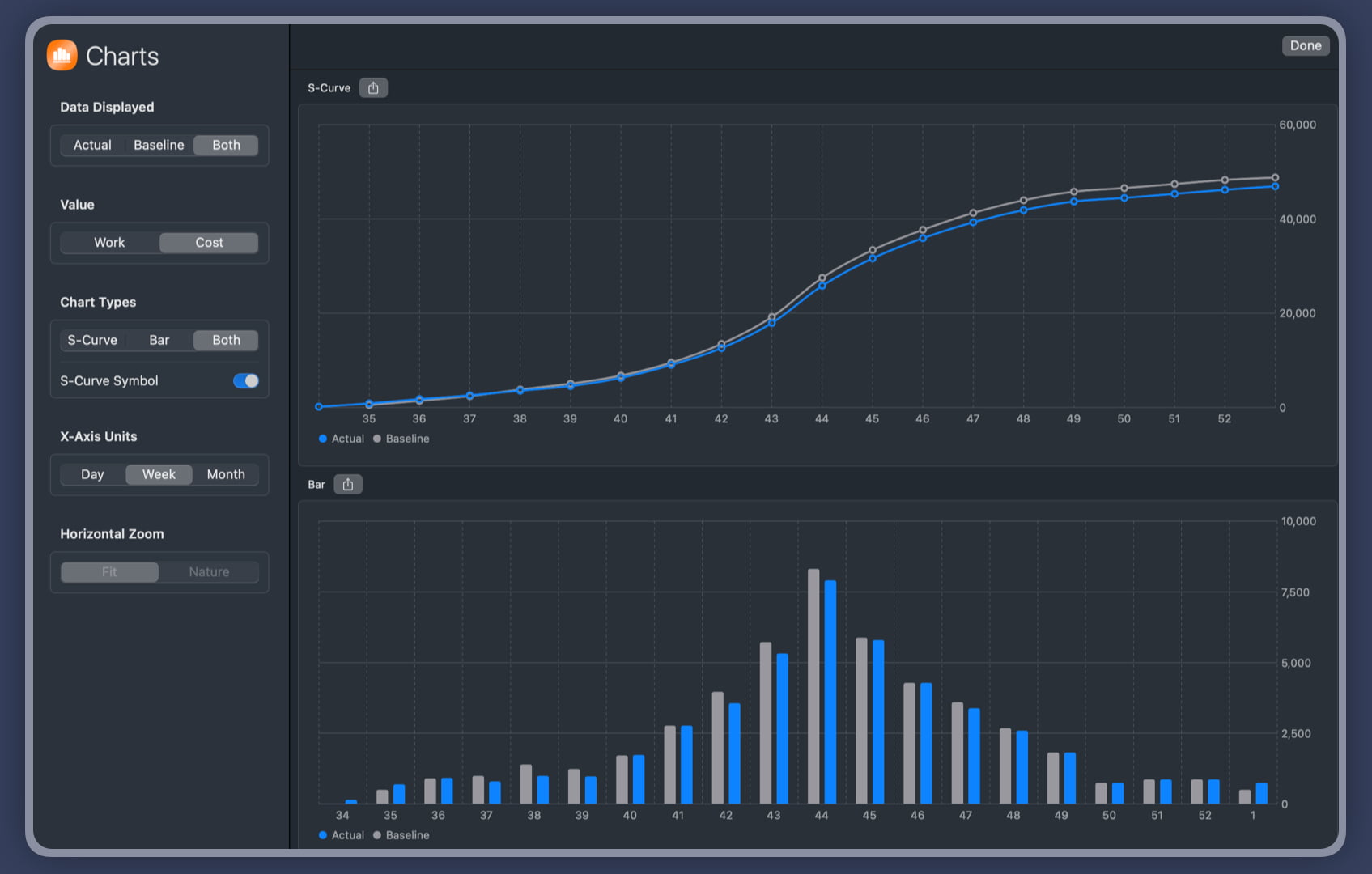 - Charts feature: shows baseline and actual data on s-curve and bar charts with output options.