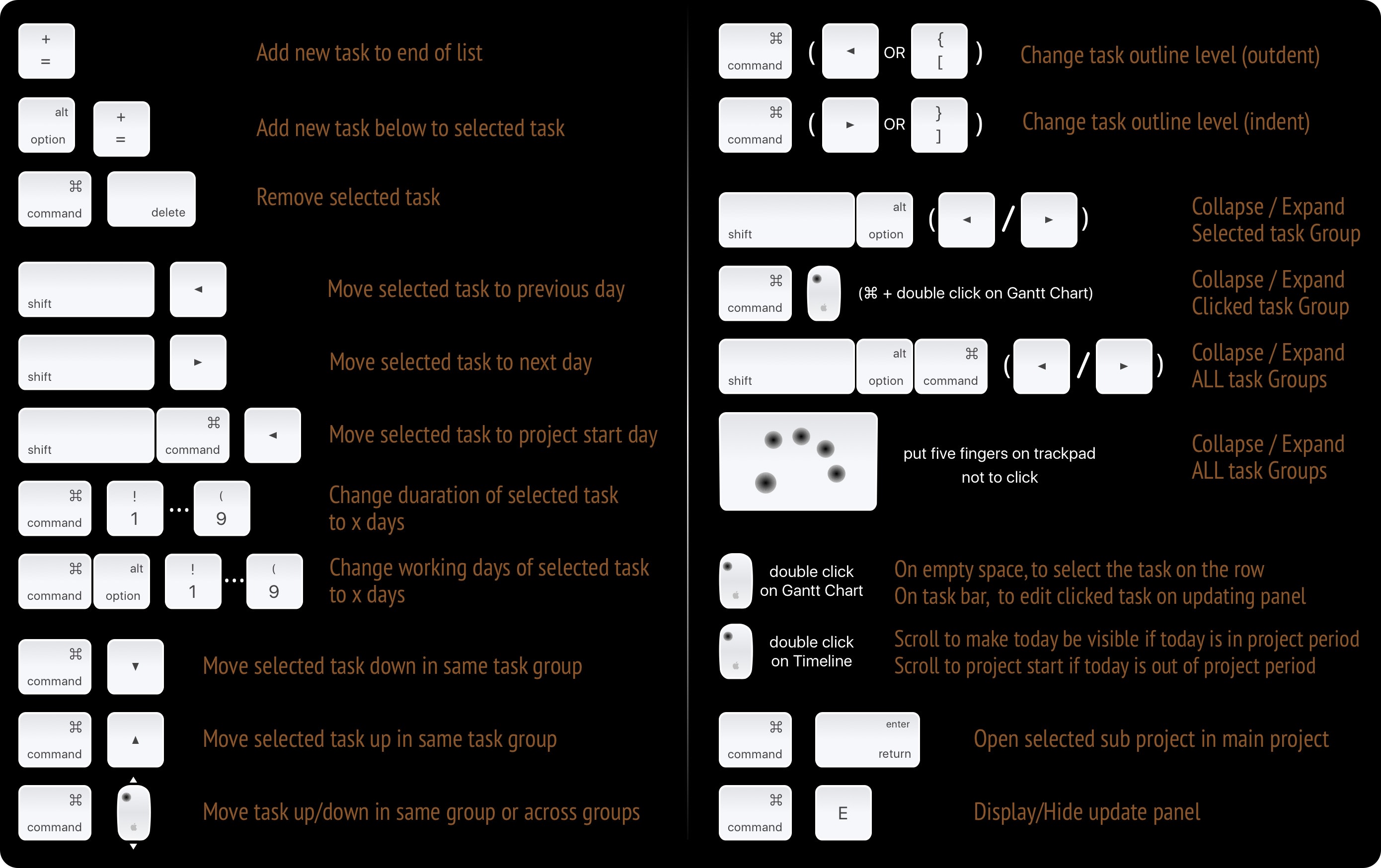 - ⌘ 1…9 ("Command" + "1 ~ 9") to change the selected task duration to 1 ~ 9 days