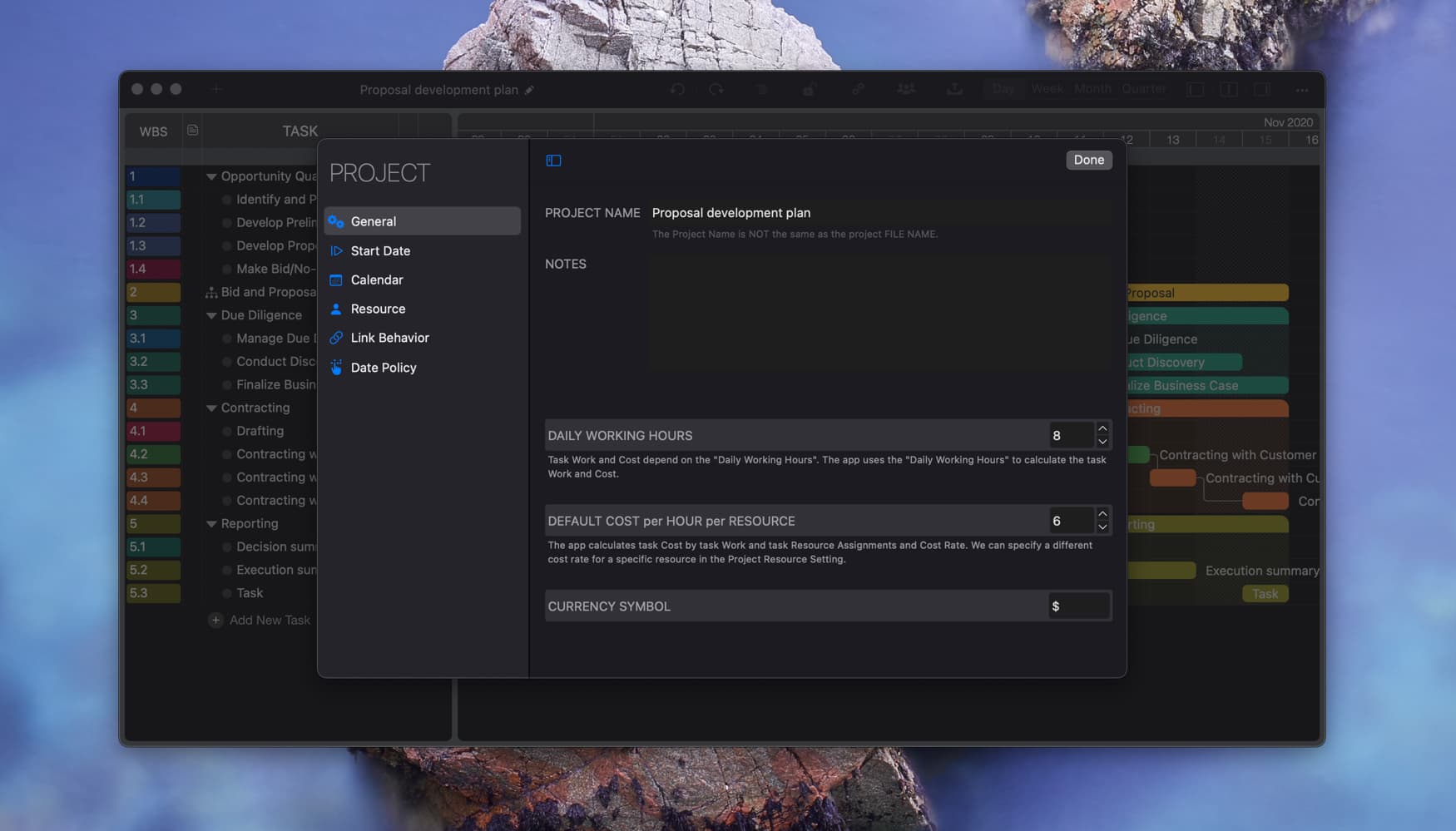 In an opened project window, tap the project name displayed on the toolbar to edit project properties include the Default Cost per Hour.