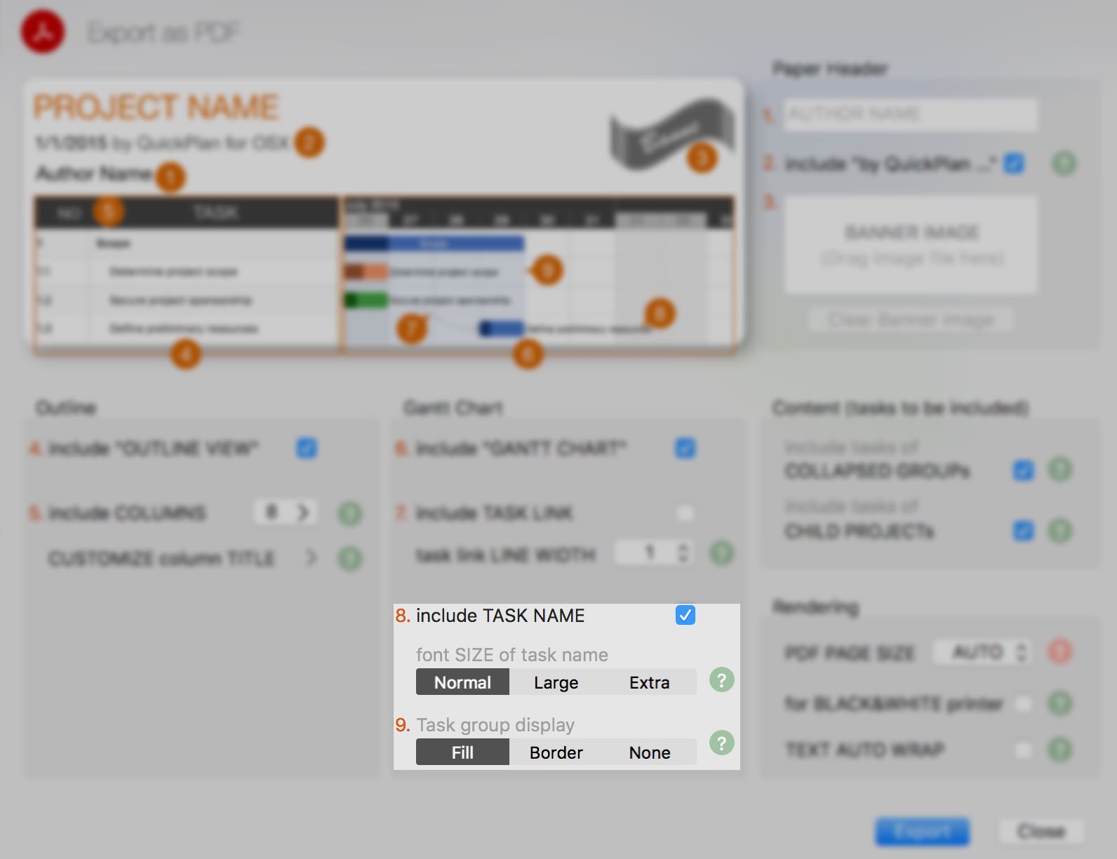There are some options to customize the to-be exported content in the PDF file.