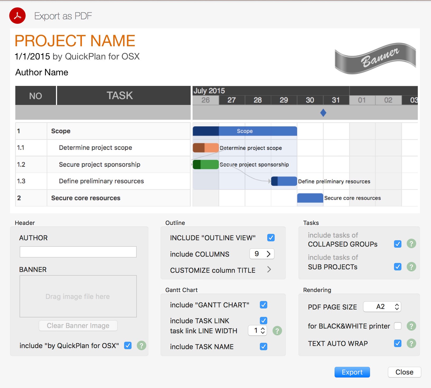 - Page content – Option to include or not include outline and Gantt chart. At least one should be included.