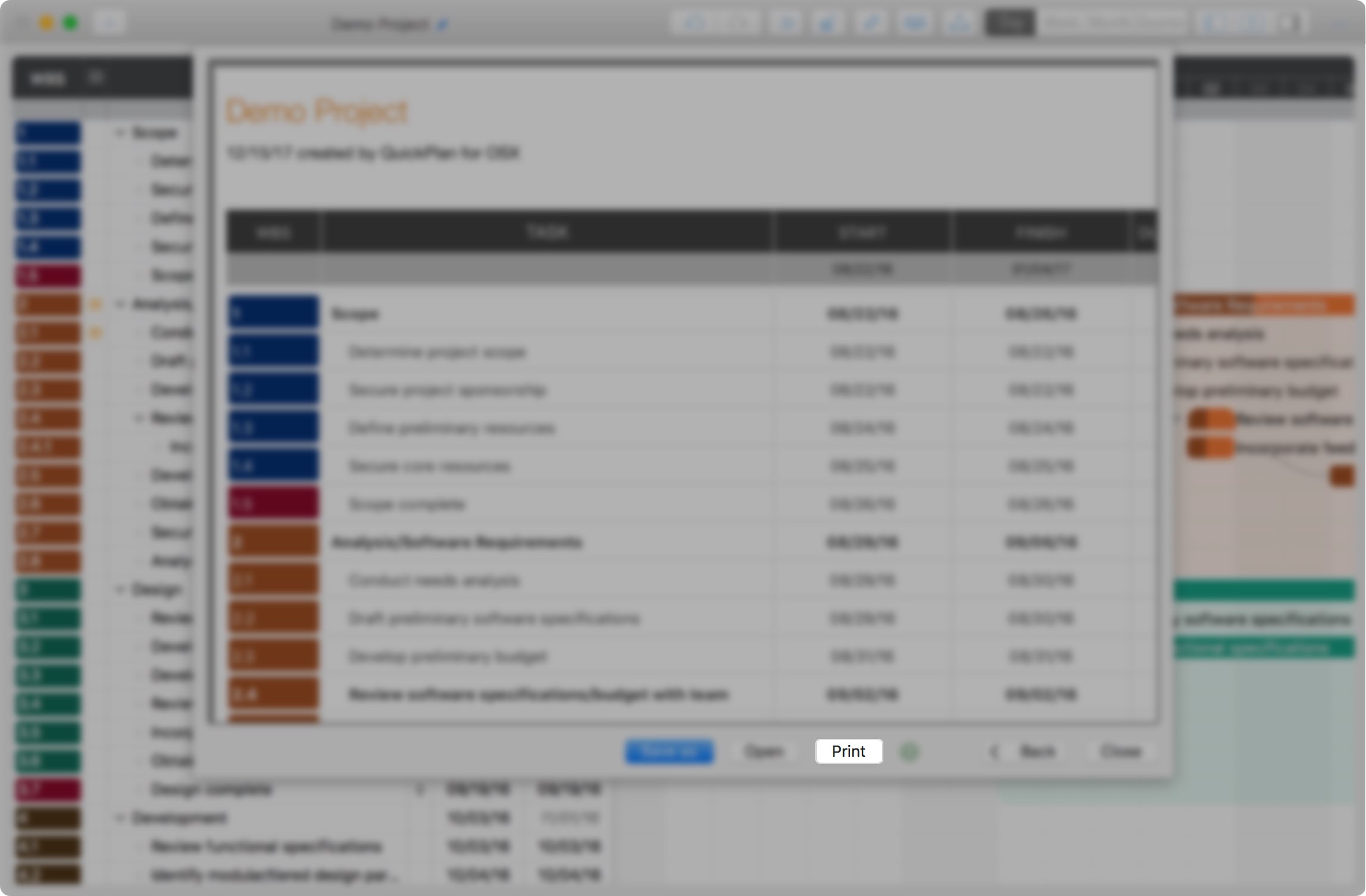The project plan generated using QuickPlan may include many tasks, or the project duration is very long. In this case, the project output corresponds to a much larger size than a piece of paper can accommodate. Please check out our practices for this challenge