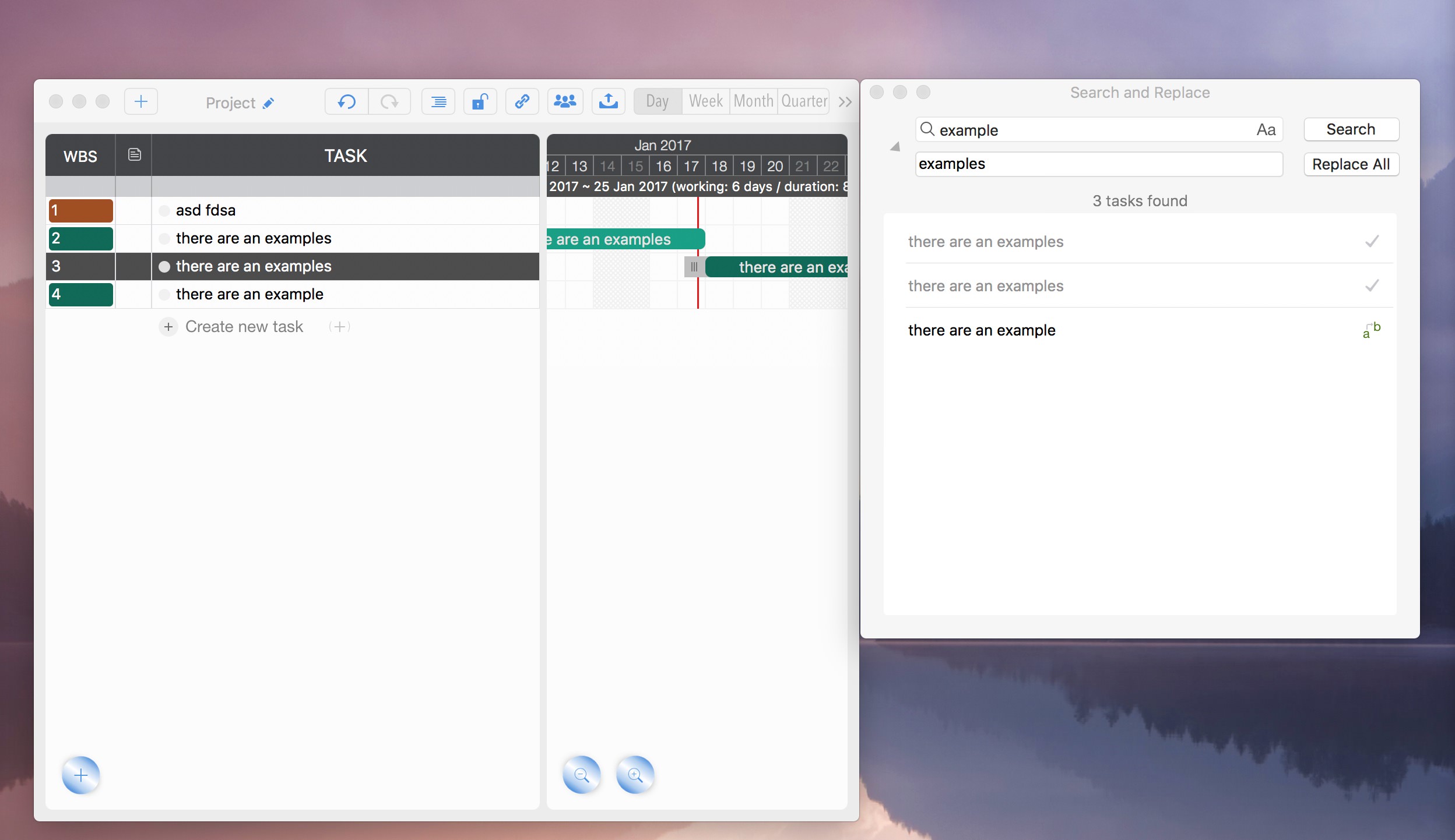 (for Task Name column only). "Command + F" to show "Search" window, "Command + Option + F" to show "Search and Replace" window.